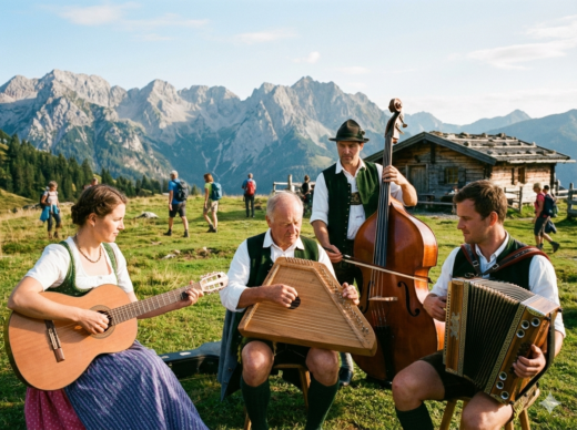 - für Volksmusik: z.B. mit einer Gitarre, Bass und Ziach (Steirische Harmonika)